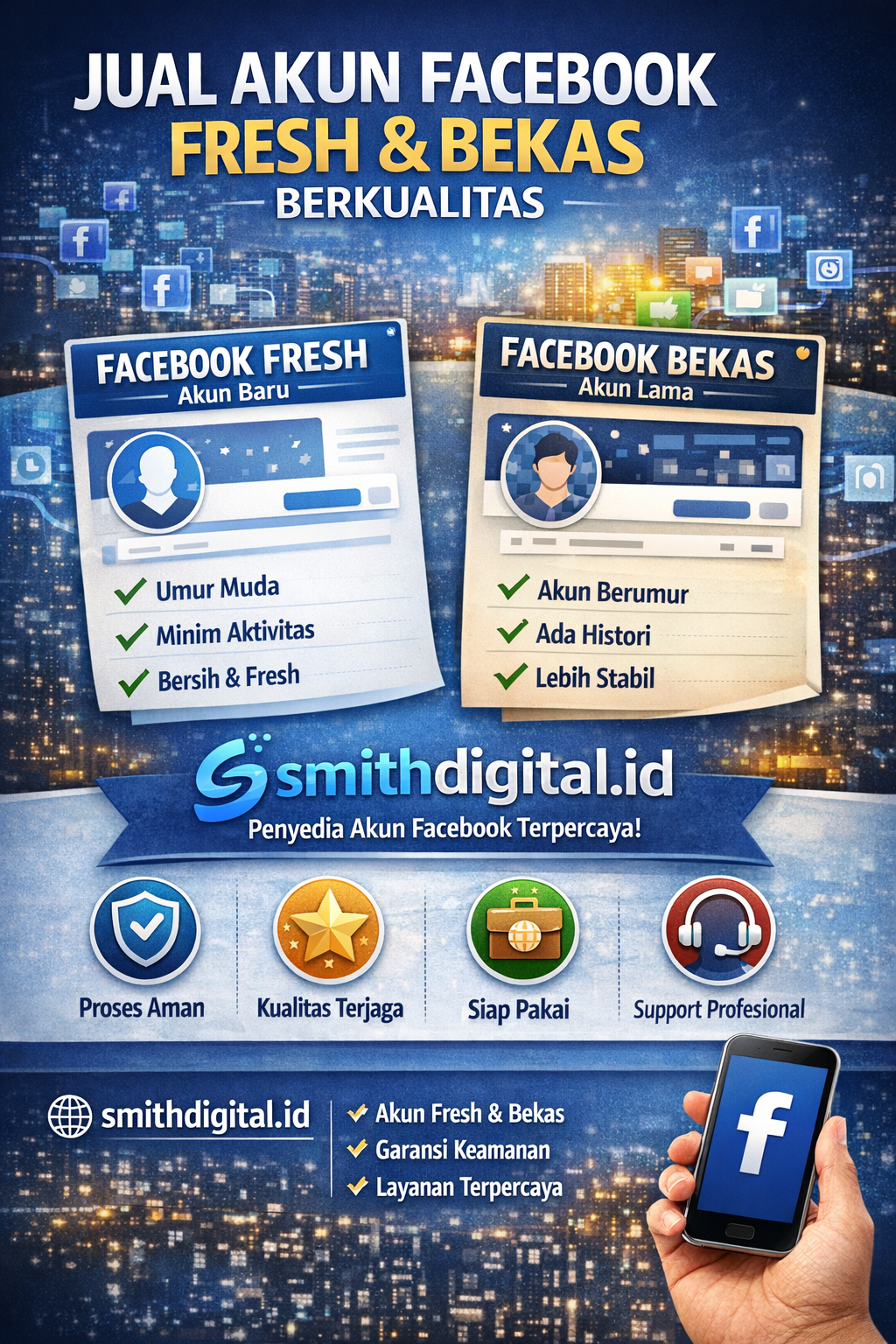 Smith Digital hadir sebagai penyedia akun Facebook terpercaya yang menawarkan berbagai pilihan akun berkualitas dengan proses aman, rapi, dan profesional.